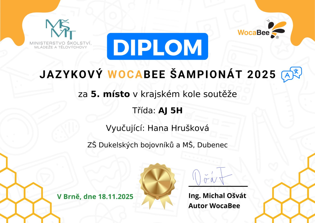 Naše 5. třída dosáhla dalšího skvělého úspěchu v jazykové soutěži WocaBee šampionát. V krajském kole, kde byla velká konkurence zejména osmých a devátých tříd, se naši páťáci umístili na výborném 5. místě.