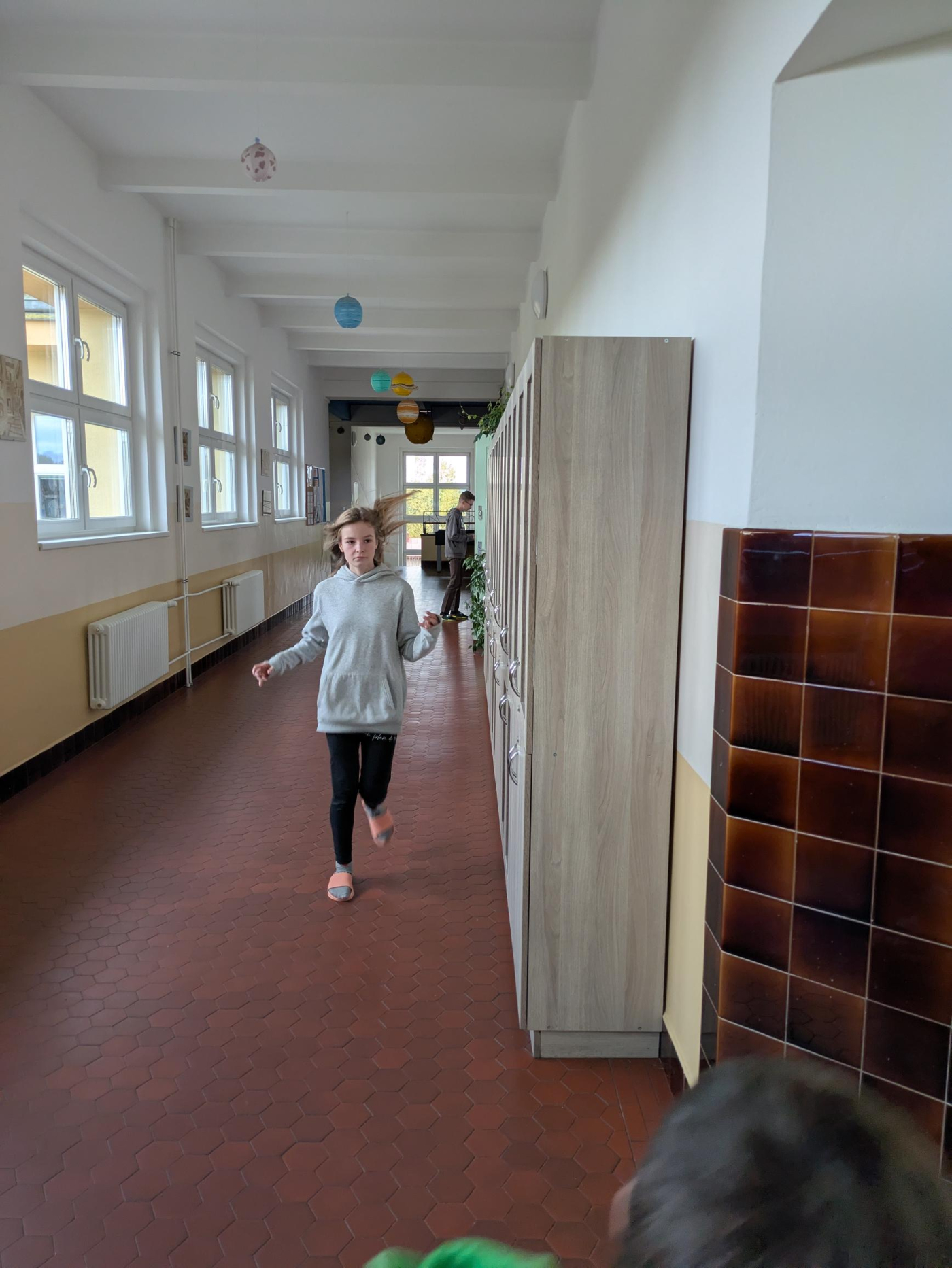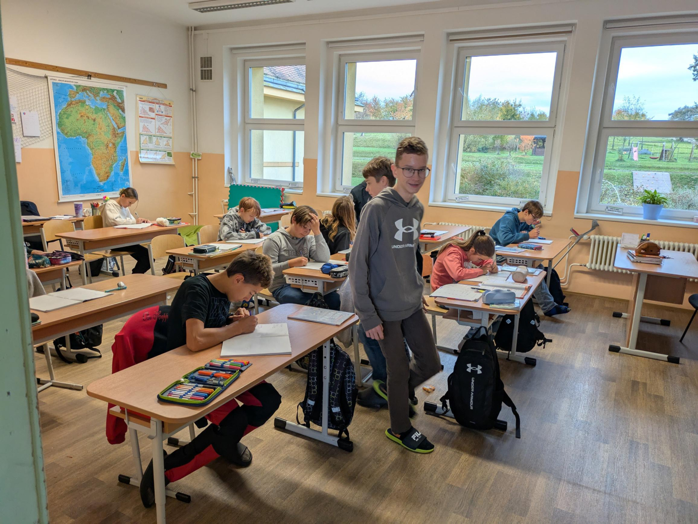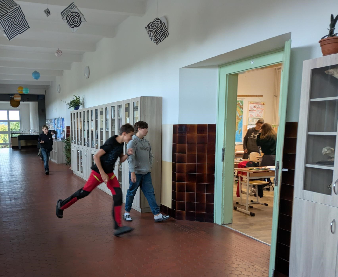 Žáci sedmého ročníku v hodině matematiky trénovali běhacím diktátem nejen výpočty se zlomky, ale také svou paměť a pozornost. Kartičky s příklady byly rozmístěné po celé třídě i na chodbě. Úkolem každého žáka bylo najít příklad, zapamatovat si ho, vrátit se do třídy, zapsat jej a vypočítat. Po kontrole správnosti výsledku mohli pokračovat k dalšímu příkladu. Aktivita byla plná pohybu, soustředění i zábavy.