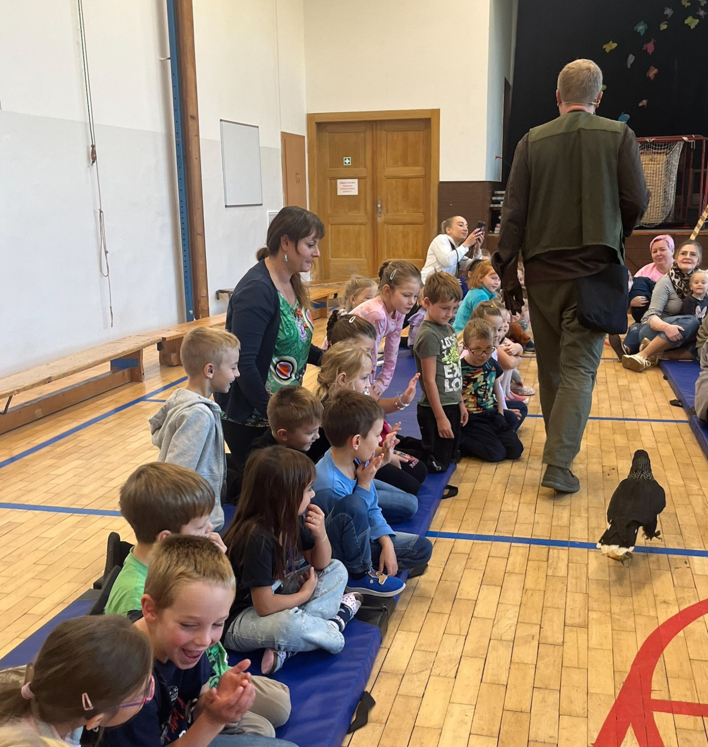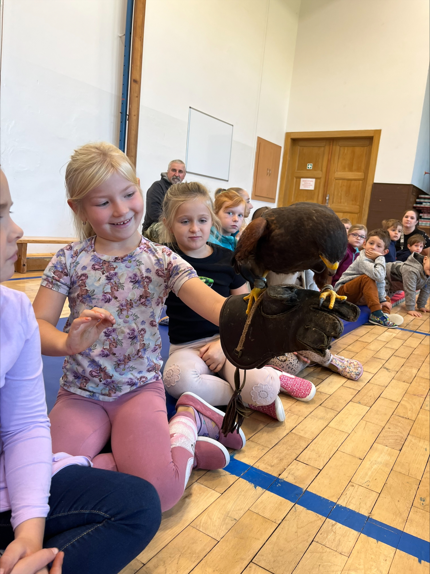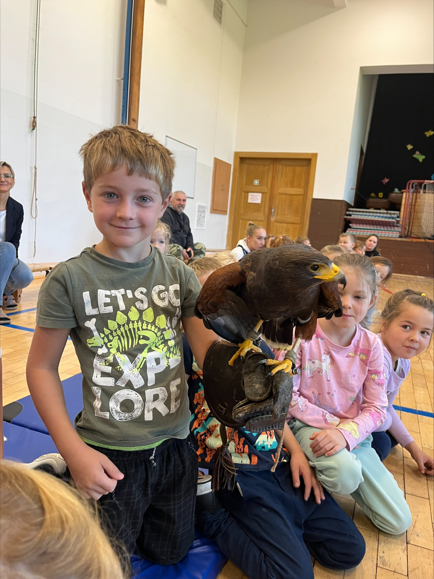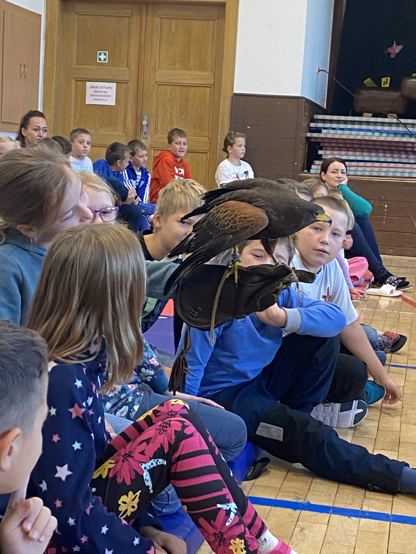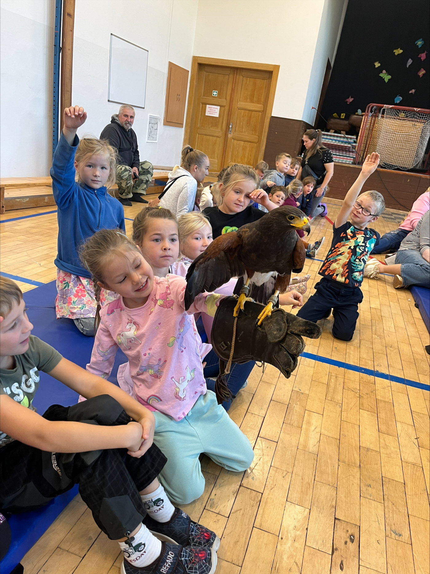 30. září přiletěli do naší tělocvičny dravci denní i noční. Výborné představení sov a dravců nám předvedl Sokolnický dvorec z hradu Landštejn. Nadšení je vidět v očích dětí i dospělých :)
