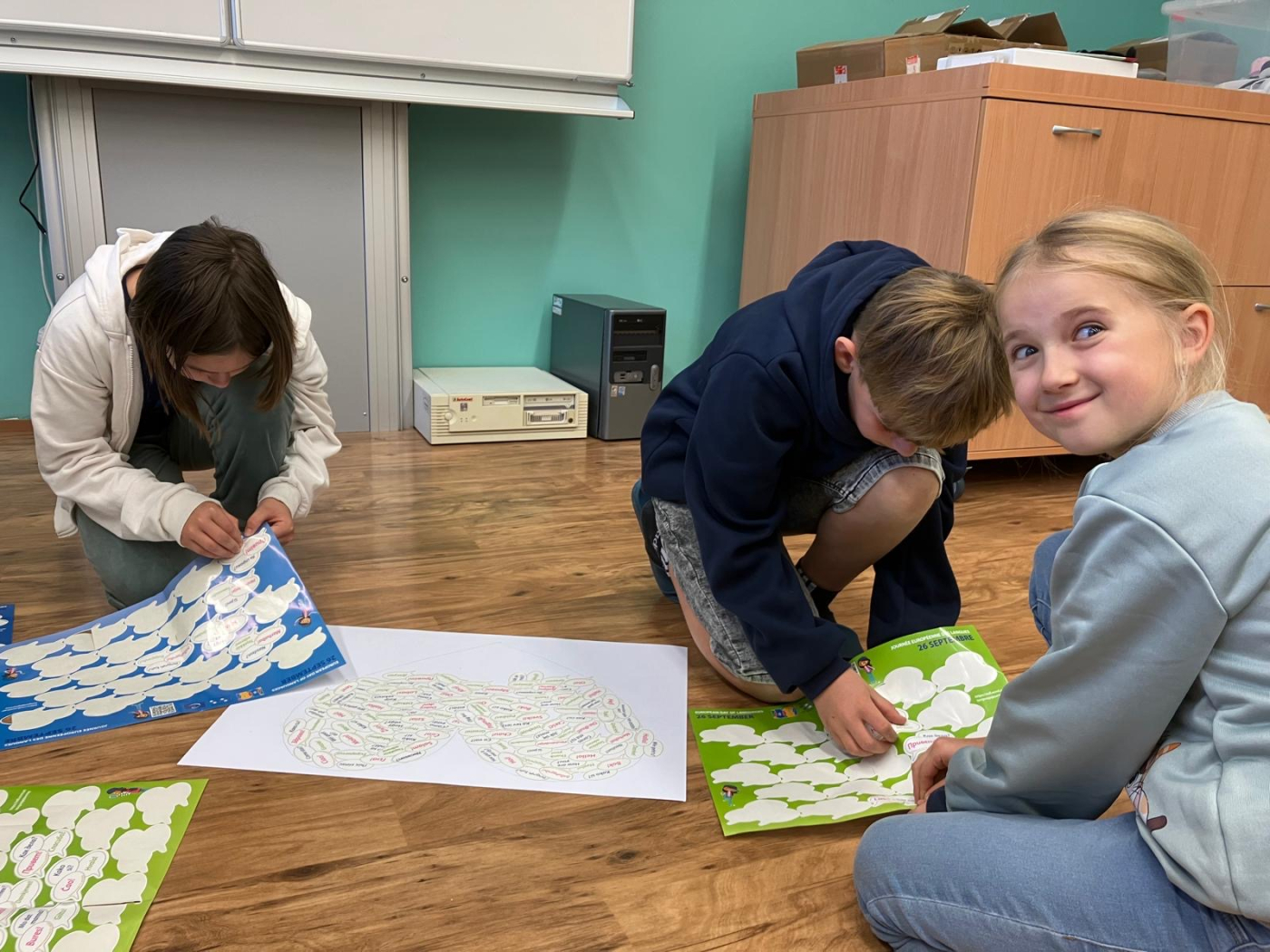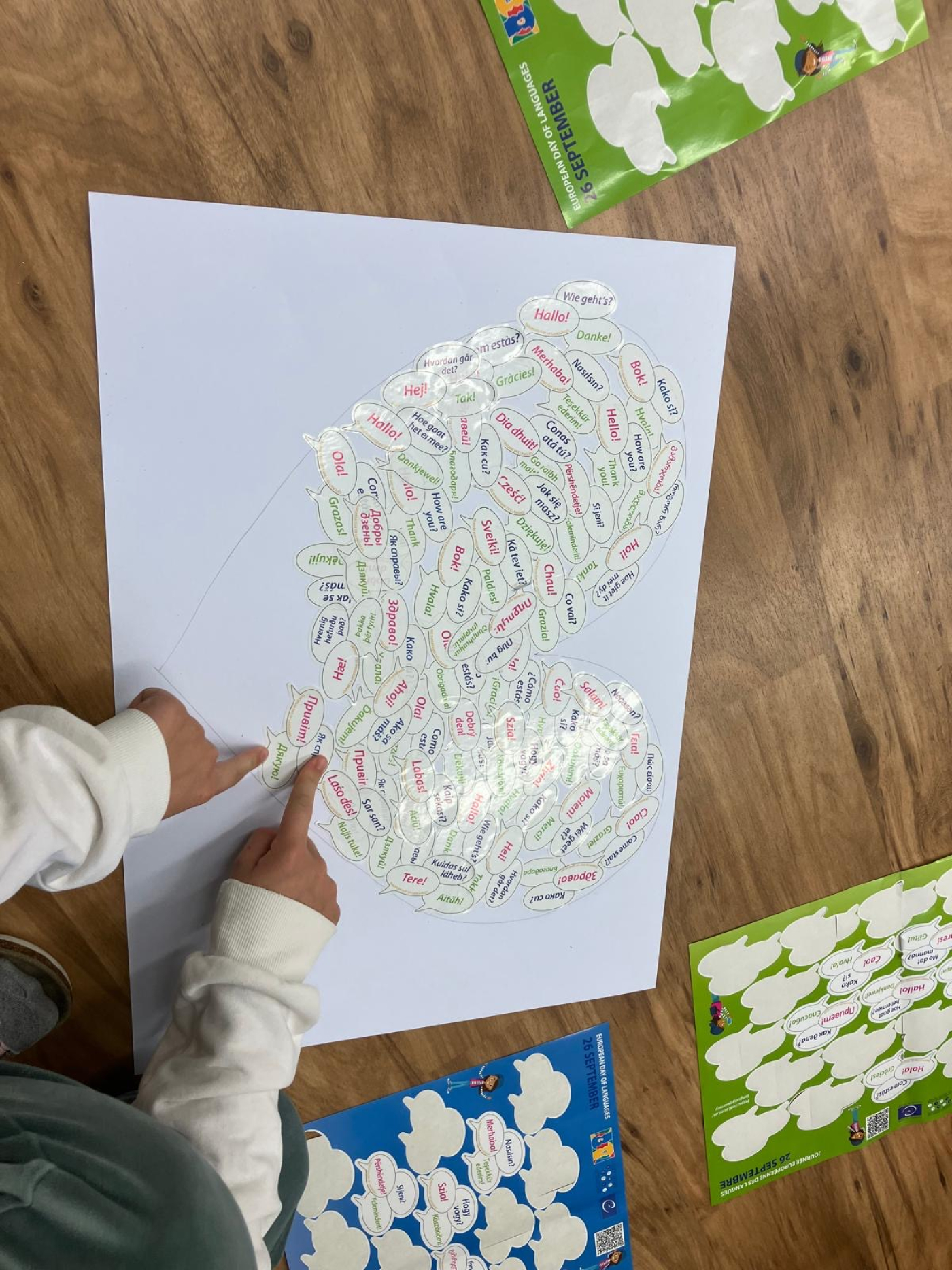 V další hodině si děti vyzkoušely rozluštit tři jednoduché fráze v různých evropských jazycích: Ahoj. Jak se máš? Děkuji. Z těchto frází pak společně vytvořily koláž, která připomíná, jak je Evropa jazykově pestrá a bohatá.