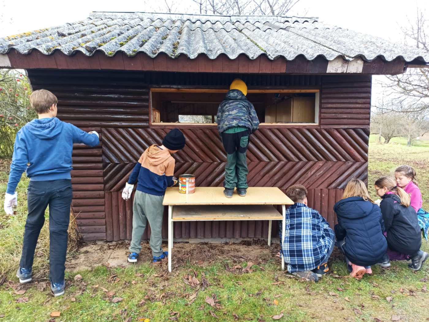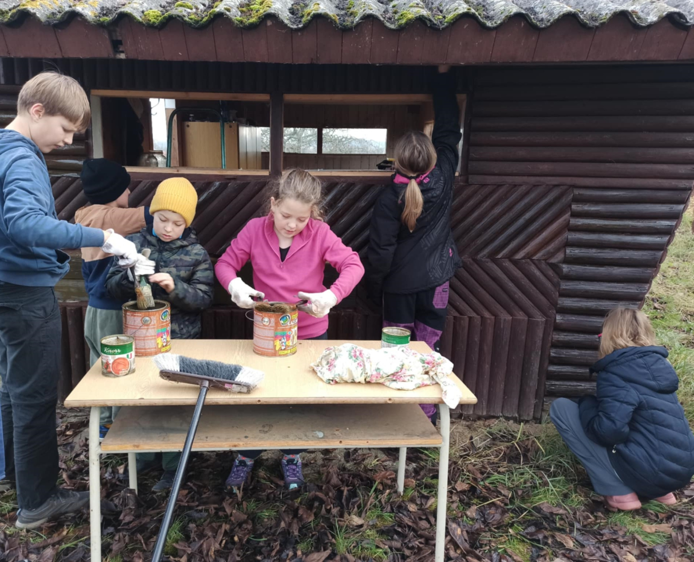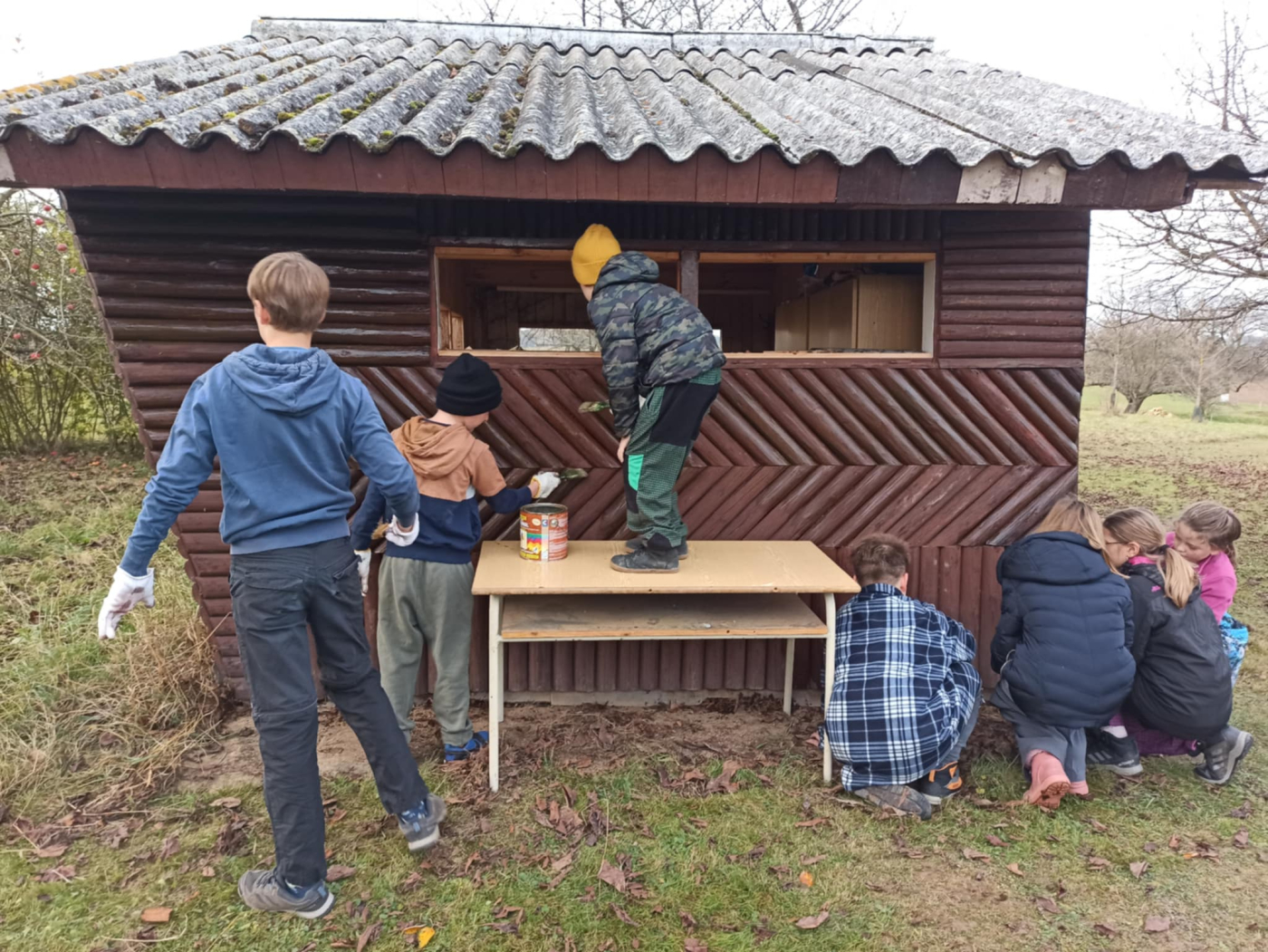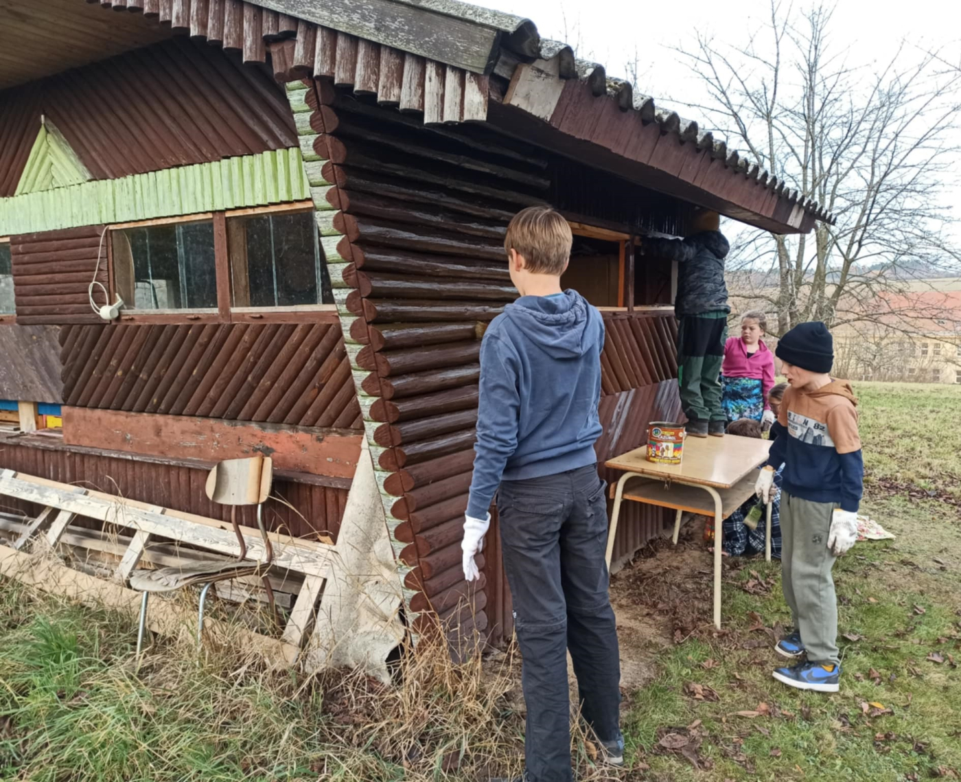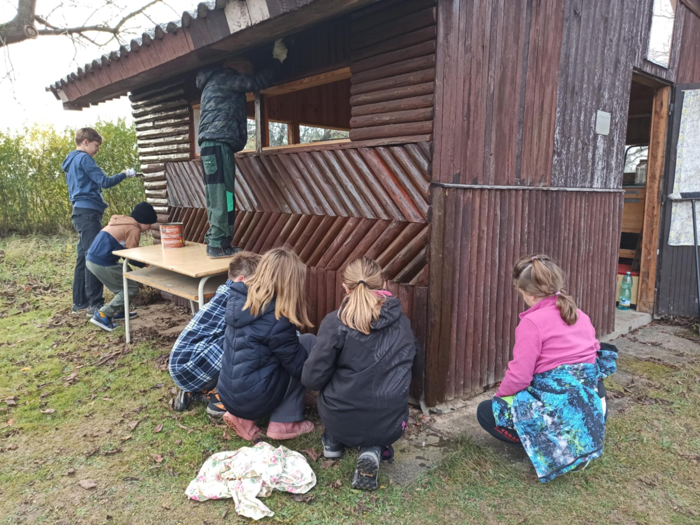 Počasí je chladné, ale neprší. Takže včelky nelétají a my se můžeme pohybovat kolem včelínu. Využíváme tento čas k obnově nátěru dřevěných částí včelínu.
