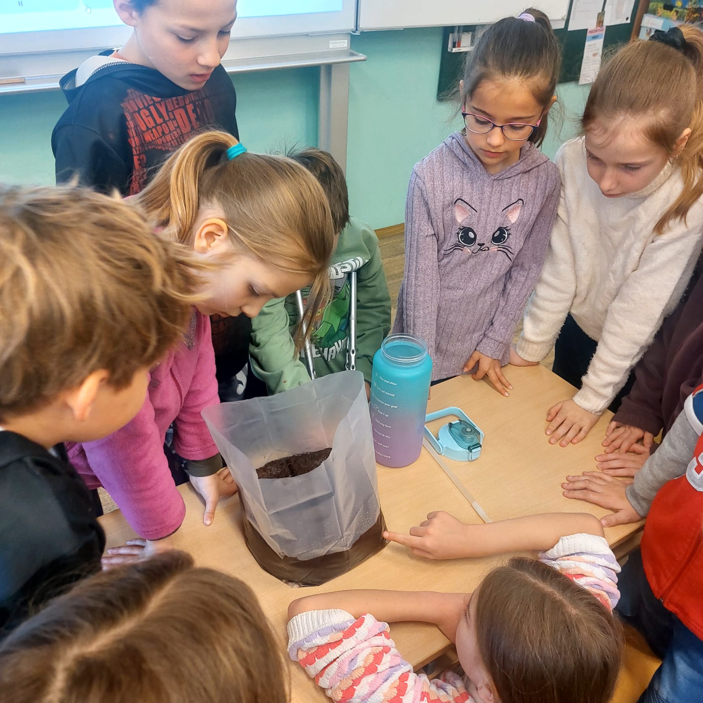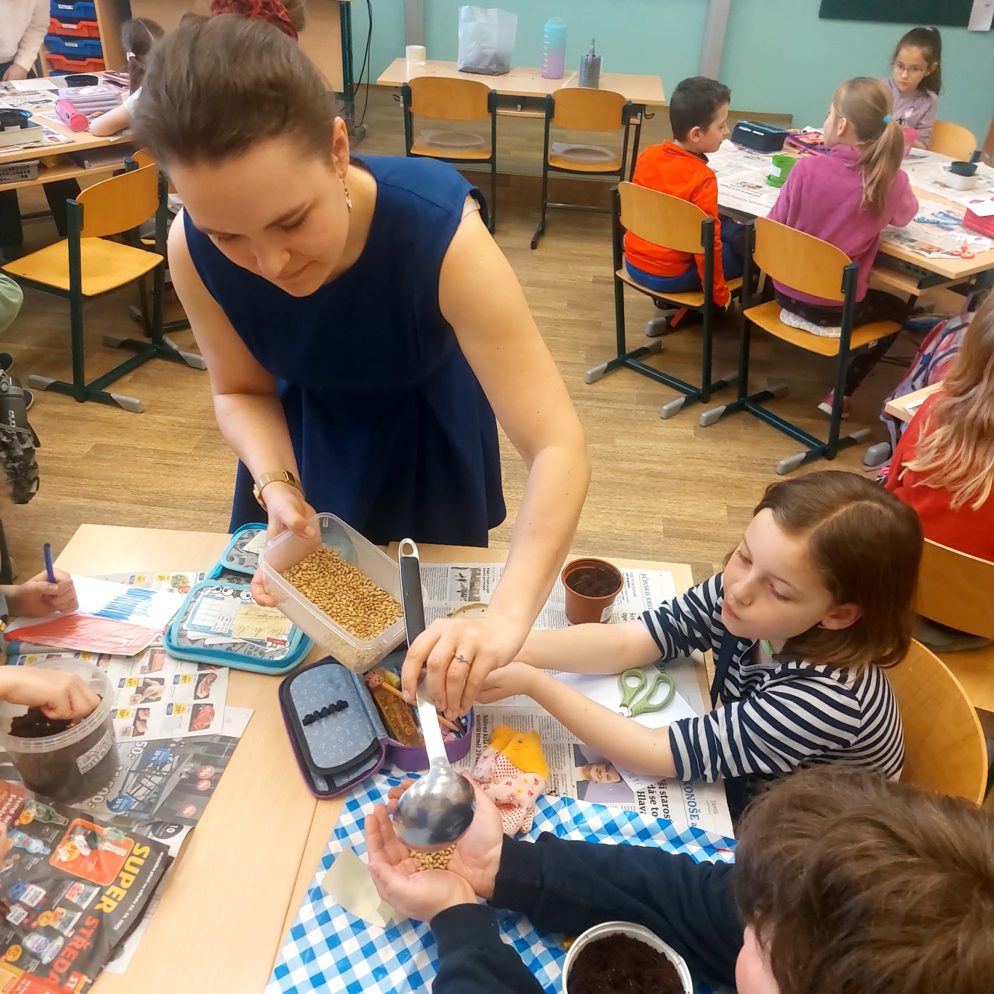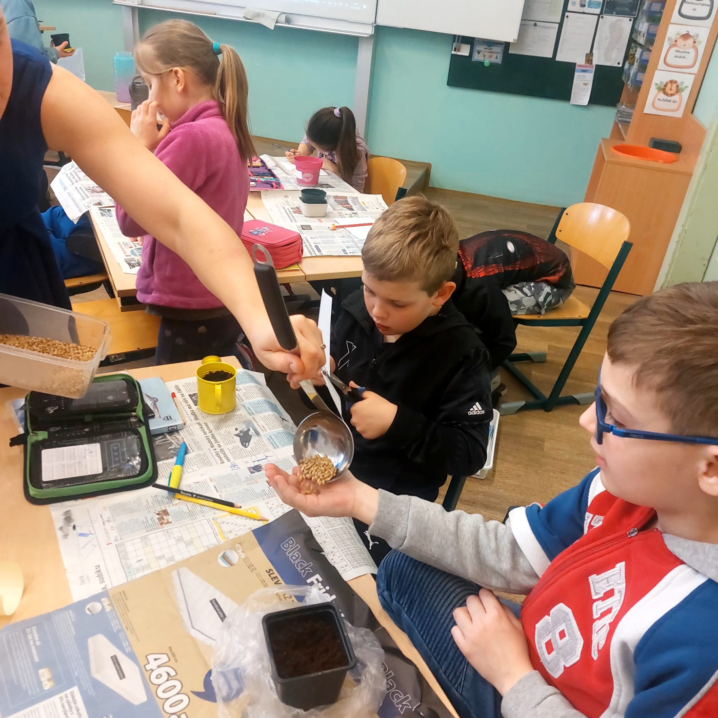 Než jsme se pustili do samotného sázení osení, vyzkoušeli jsme si malý experiment se substrátem. Děti s úžasem sledovaly, jak během pár minut nasál vodu a několikanásobně zvětšil svůj objem.
