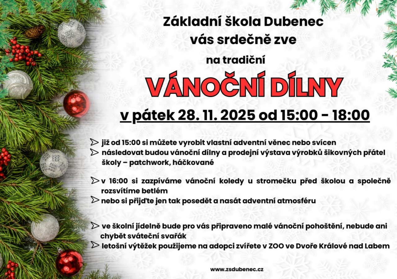 Srdečně Vás zveme na tradiční vánoční dílny do základní školy v Dubenci.
