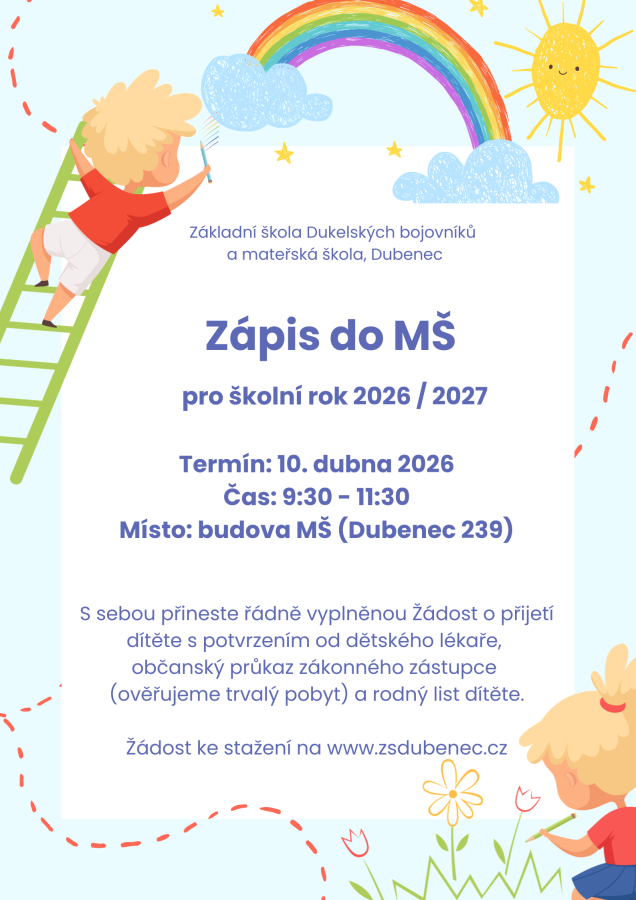 Zápis do mateřské školy v Dubenci se koná v pátek 10. 4. 2026 v budově MŠ.